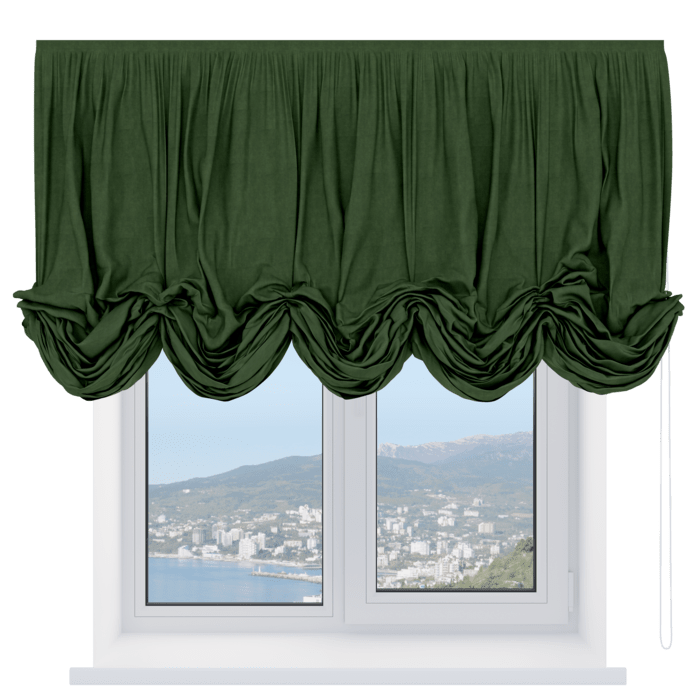 Австрийская штора вельвет тёмно-салатовый, карниз верёвочный
