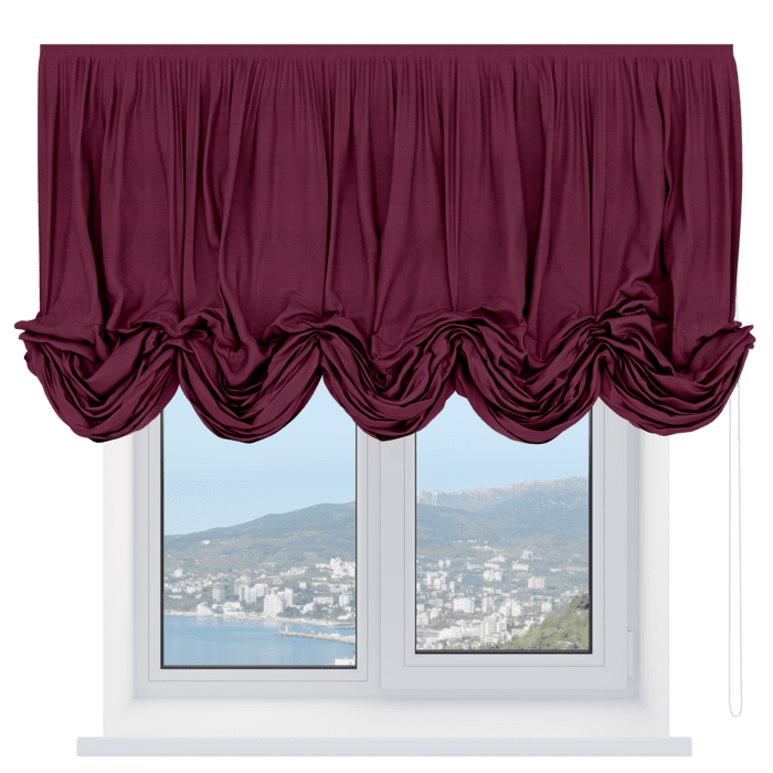 Австрийская штора вельвет бордовый, карниз верёвочный