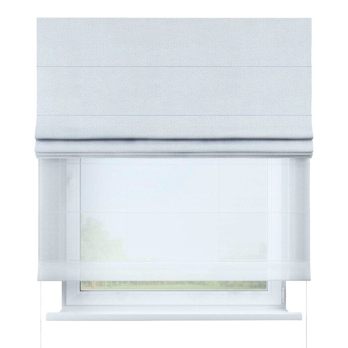Римские шторы День-Ночь – система из двух отдельных полотен: полупрозрачный тюль для рассеянного света днем и плотная ткань (блэкаут) для затемнения ночью. Управление полотнами независимо друг от друга для максимальной регулировки освещенности и приватности.