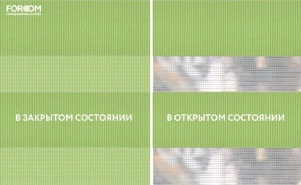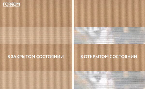Полотно ткани, состоит из чередующихся горизонтальных полос – прозрачных и непрозрачных. Изменяя положение этих полос относительно друг другу, можно создать целых 3 режима регулировки светом. Например, чтобы в помещении стало светлее, нужно расположить прозрачные полосы друг напротив друга. Если разместить прозрачную и непрозрачную полосу параллельно друг другу, то можно добиться практически полного затемнения.